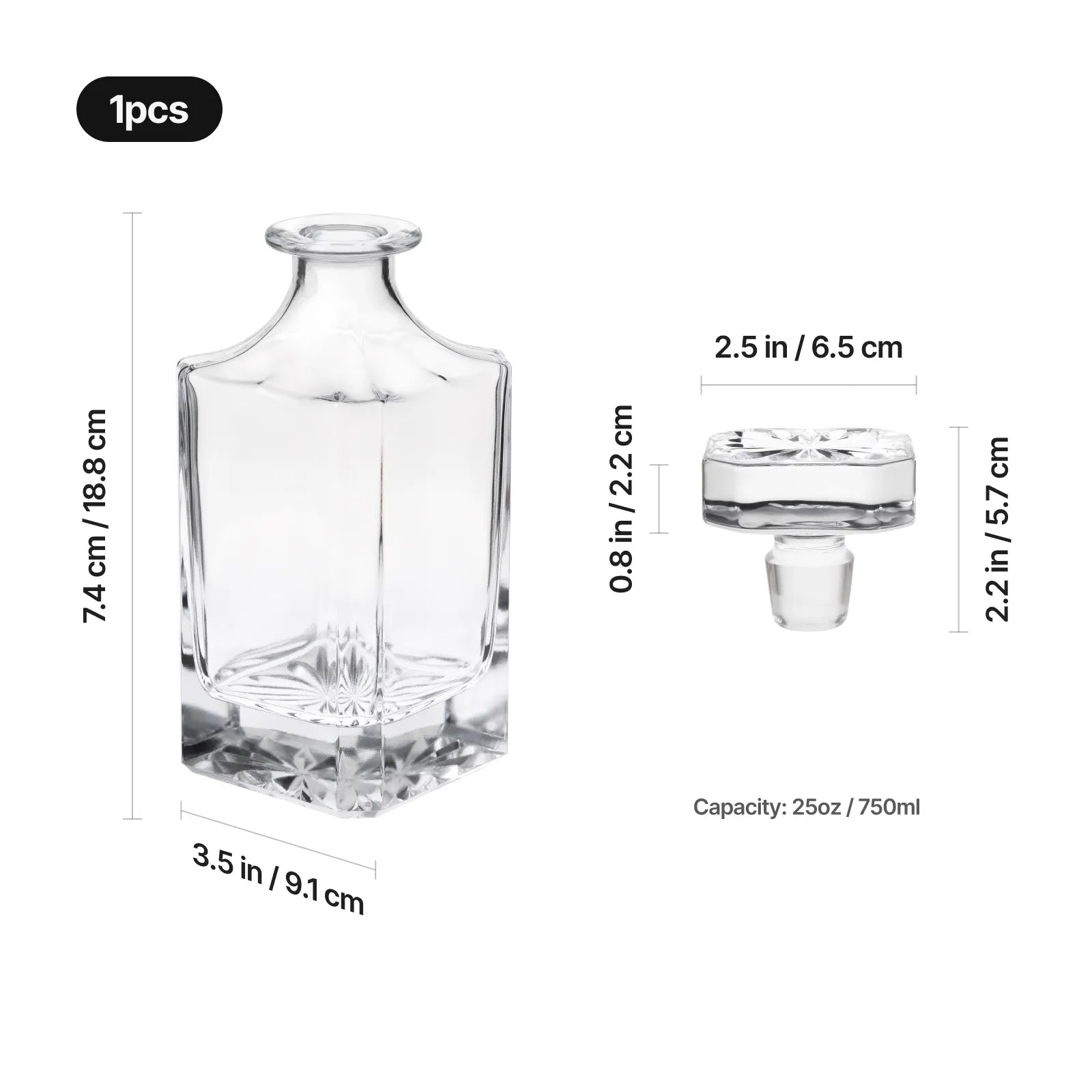 Cap Thickness:0.8in / 2.2cm - What's Included1 x 25oz Whiskey Decanter