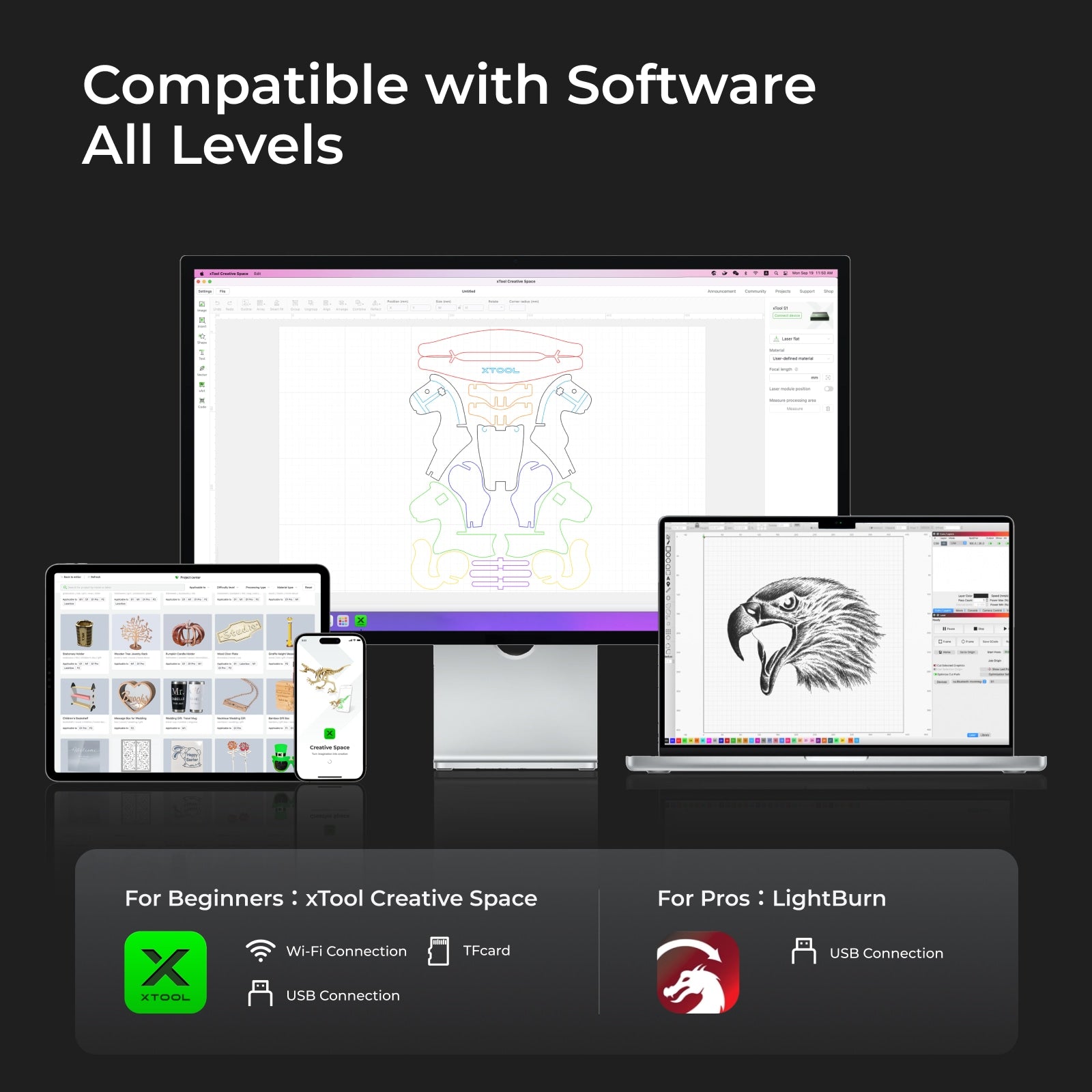 Our free software, XCS, offers 500+ shape collections, 1000+ projects and smart functions such as AI drawing, Auto-focus and Auto-snapping for beginners' use. LightBurn is also supported for pro use.