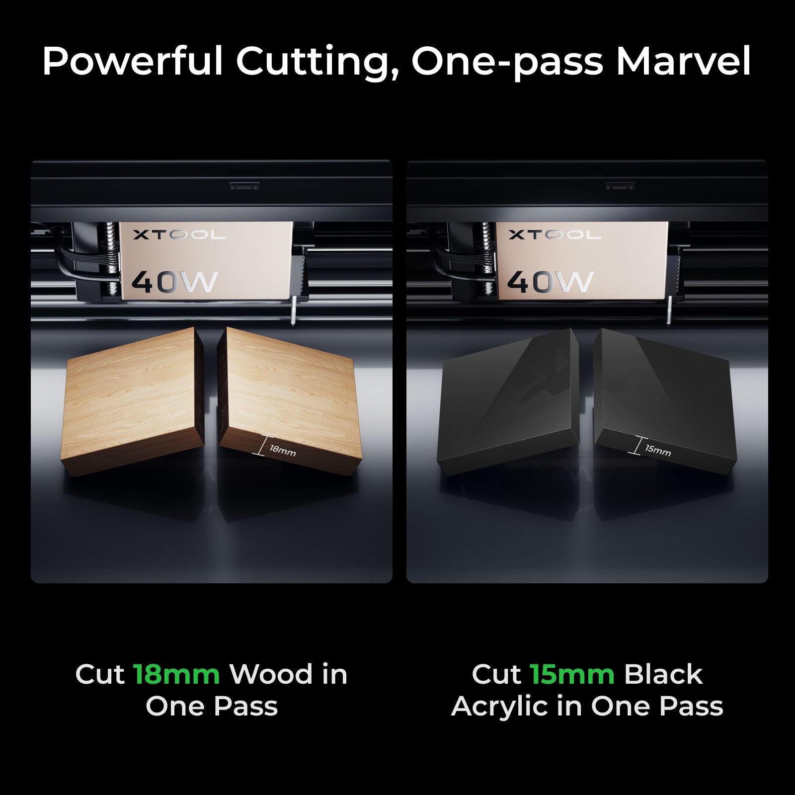 40W blue laser cuts 18mm wood in one pass. It also enables deeper engraving on wood, rock, and more. You can even get amazing 3D illusions, stacked carvings with it.