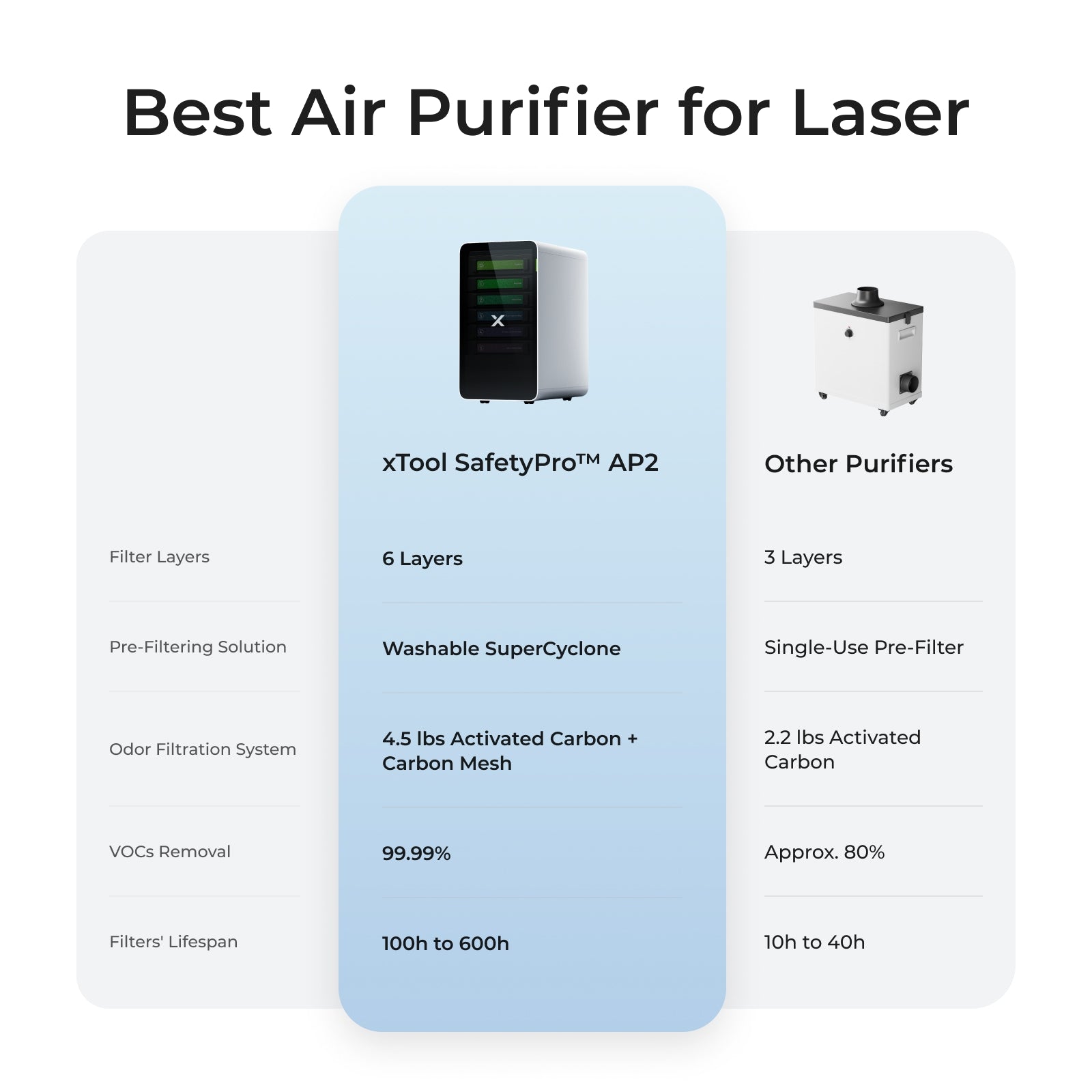 The AP2’s 150m³/h airflow efficiently purifies desktop tasks. The AP2 Max unleashes a dominating 700m³/h, engineered for thick, large-format industrial laser and welding jobs.