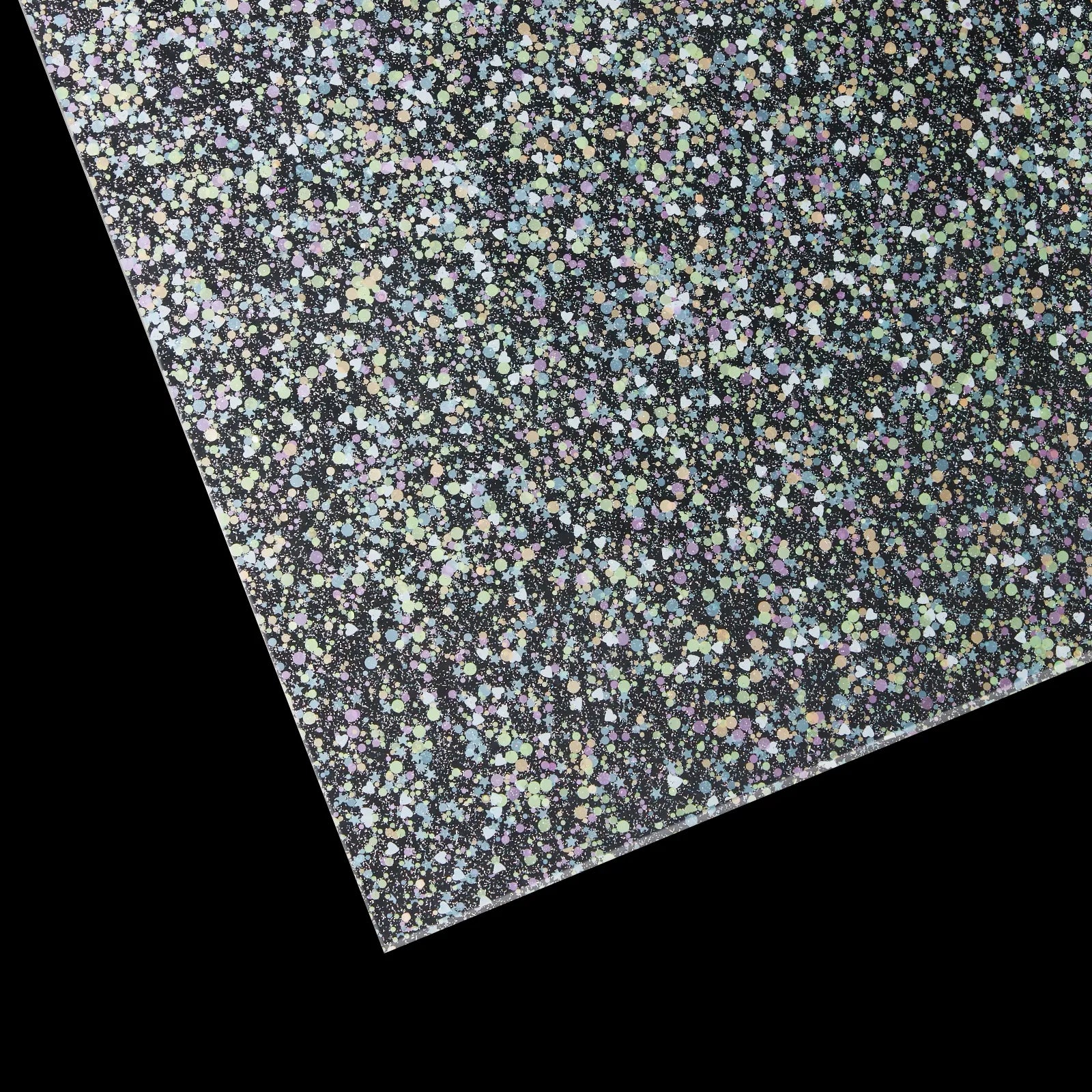 - The heart and stars glitter dots transparent acrylic sheet plexiglass is colorful. Acrylic front and back can present colorful heart and star patterns with fine glitter. Add a touch of elegance to your artistic creations. It is suitable for home decoration and ornaments, and the colorful polka dot pattern can bring a unique effect. It is highly resistant to stains and can be easily kept clean by simply wiping it with a damp cloth or water.