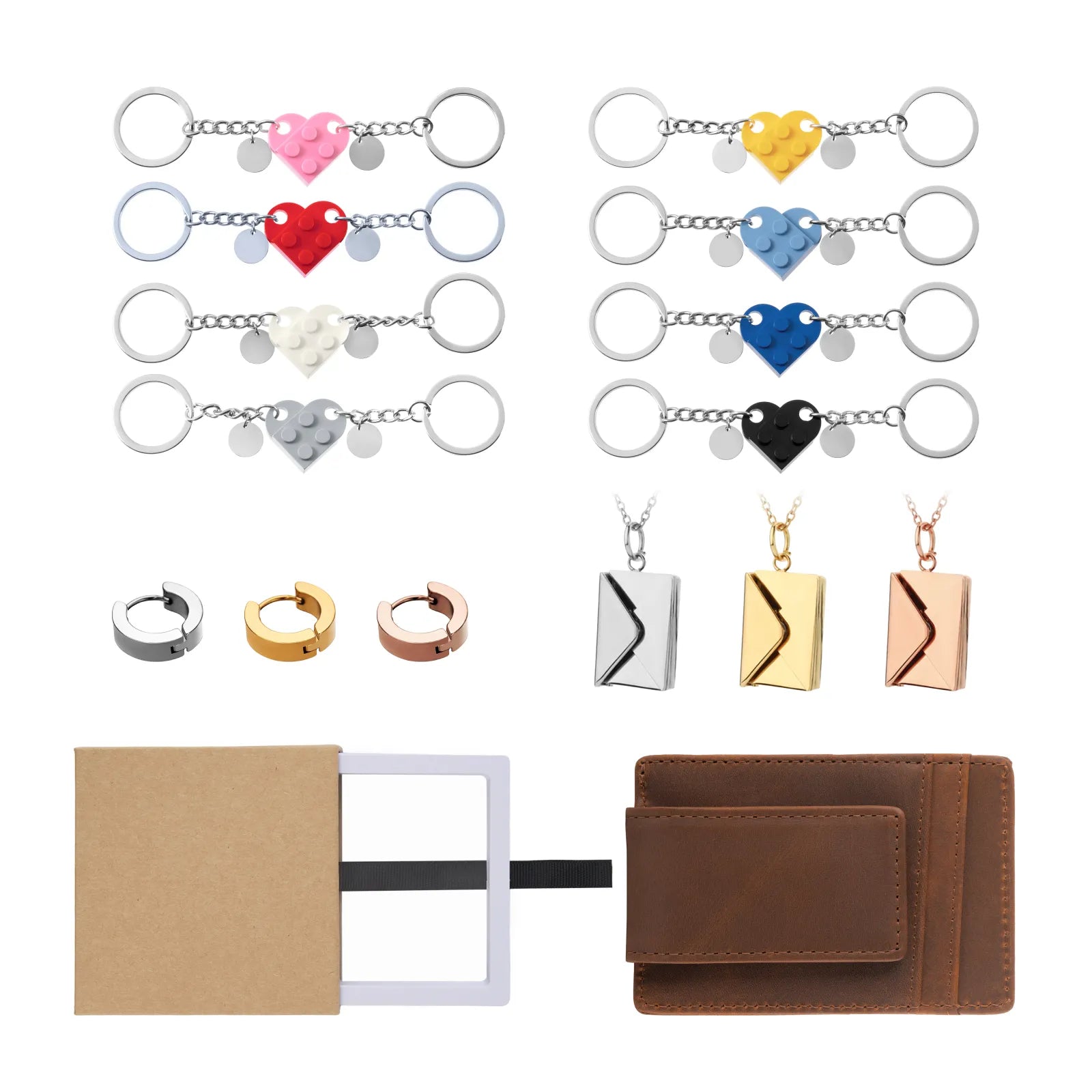 - All-in-one gift set. Includes premium keychain, necklace, stud earrings, wallet, and jewelry box—everything you need.