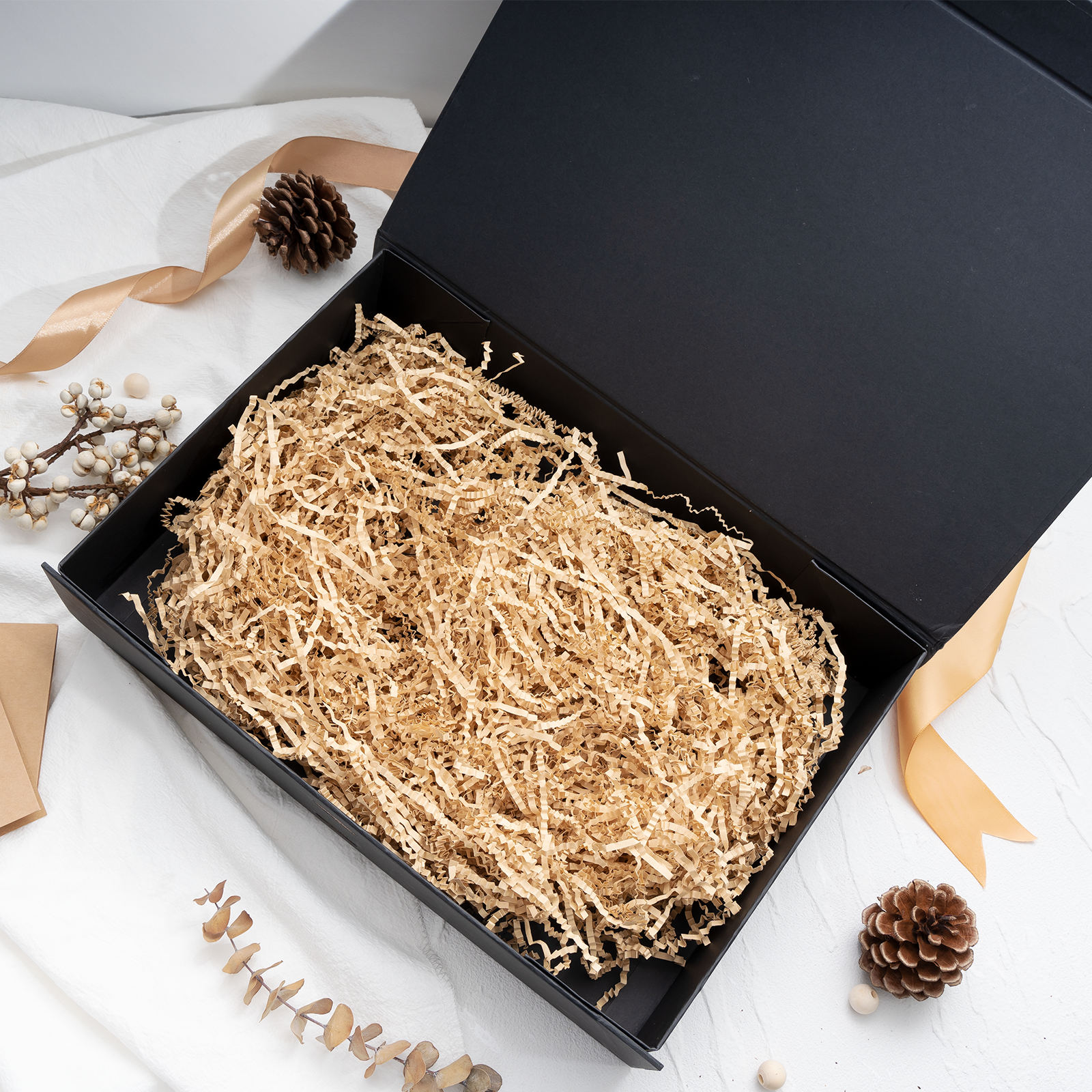 - This product contains champagne ribbon, raffia, and kraft paper.