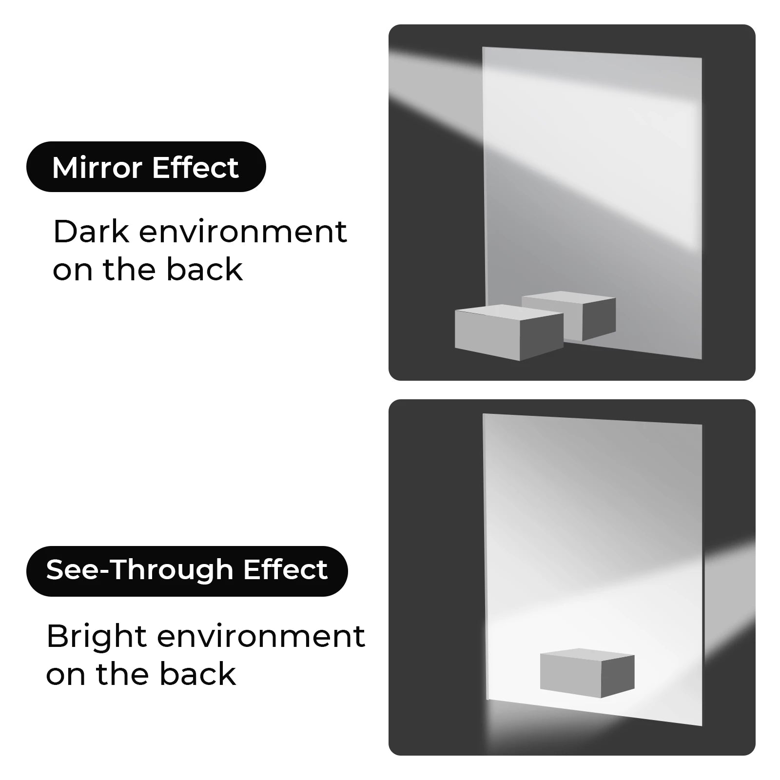 - See-through mirror acrylic has two different visual effects. When you place the back of the acrylic in a dimly lit environment, such as a floor or table, you will see the acrylic on the front side with a mirror effect. When you put the back of the acrylic in a bright environment, such as computer screens, desk lamps, you can see through the acrylic to the back of the scene, which will be seen in the front of the acrylic translucent effect. It can be used for a smart mirror, surveillance, or privacy applications.